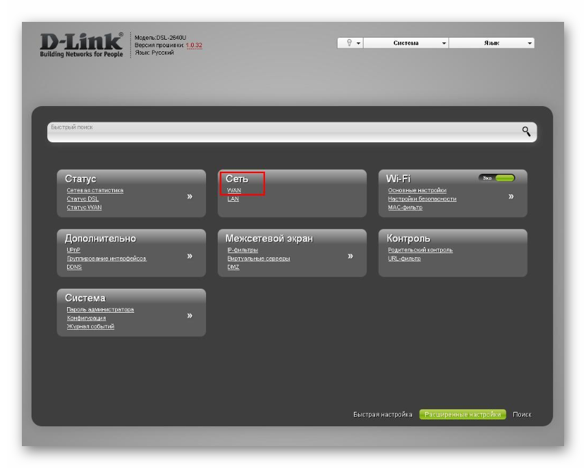 Действия в новой и старой прошивке аналогичны, но немного различаются. Опишем порядок действий для настройки Wi-Fi на D-link DSL-2640U в сером интерфейсе: