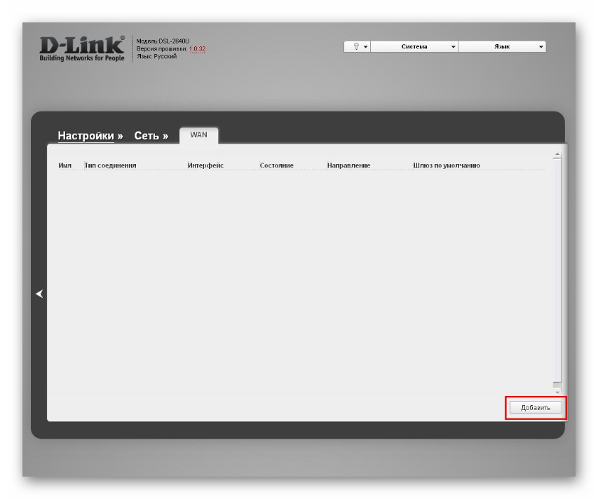 войдите в вэб – панель, на вкладке WAN приступите к созданию нового подключения («Добавить» или «Add»);