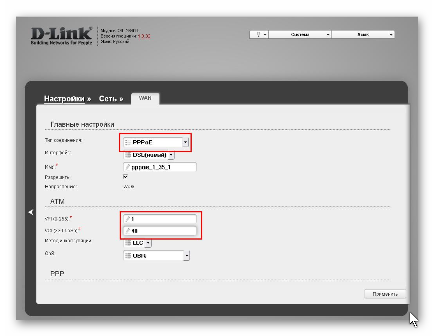 - VPI и VCI своего региона (узнать можно у техподдержки).
