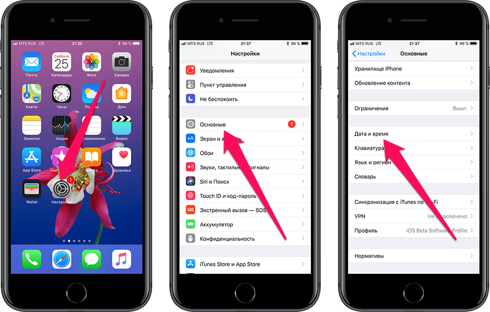 - Далее выберите «Настройки» – «Основные» – «Дата и время».