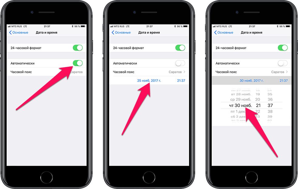 Отключите переключатель «Автоматически » и смените дату (не время, это важно), указав любой следующий день. Например, если сегодня 13 ноября, то выберите в качестве даты 13 декабря