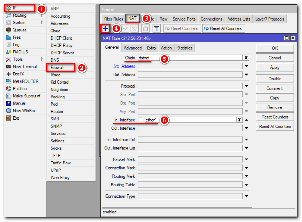 Для случая, когда нам нужно на MikroTik пробросить все порты и сервисы до компьютера, который находится за “натом”, чтобы обращаться к нему по белому IP, воспользуемся действием Netmap: