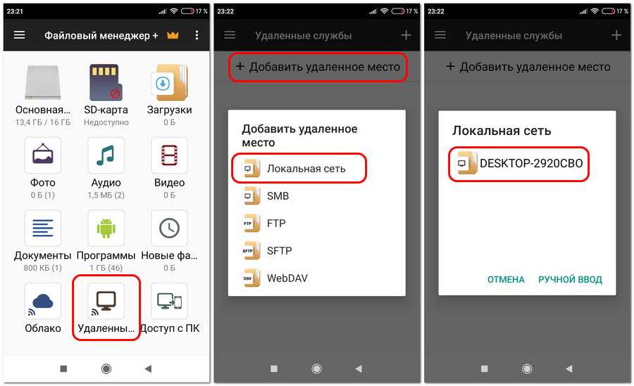 В этом приложении жмём иконку «Удалённые службы», далее – «Добавить удалённое место», далее – «Локальная сеть». После непродолжительного сканирования сети увидим наш компьютер. Жмём его.