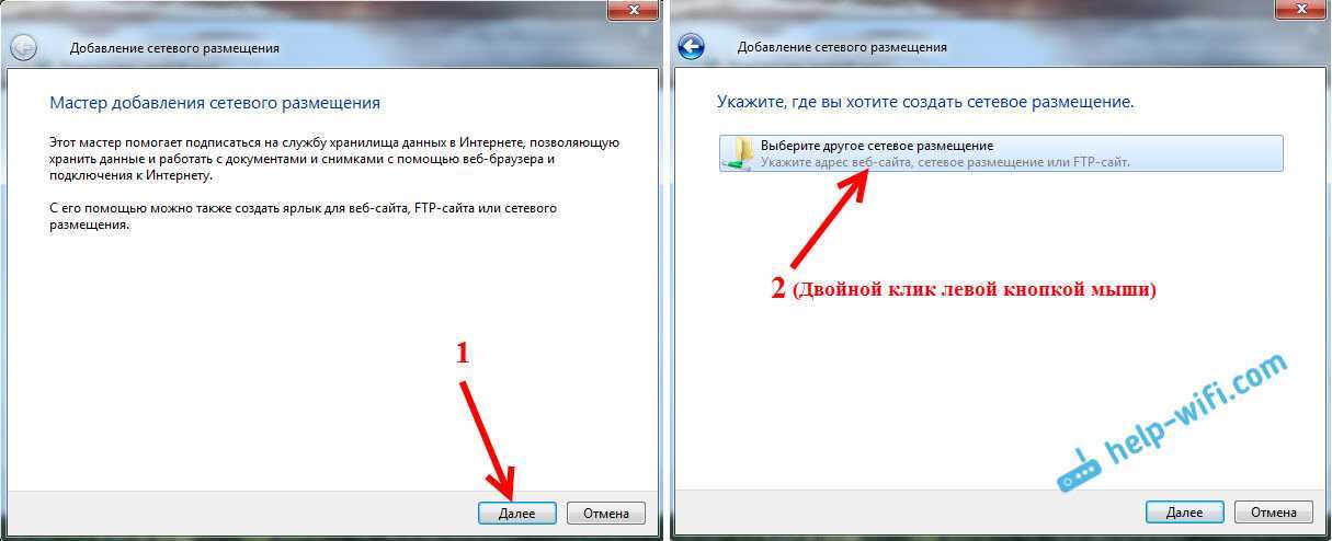 Откроется еще одно окно, в котором нажимаем «Далее». В следующем окне нажмите два раза на пункт «Выберите другое сетевое размещение».