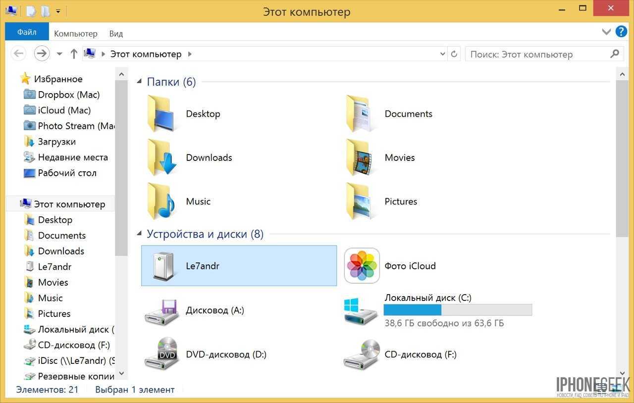 В Windows, подключенныйiOS-девайс, распознается системой как отдельный накопитель и будет доступен в приложении «Мой компьютер» среди разделов жесткого диска.