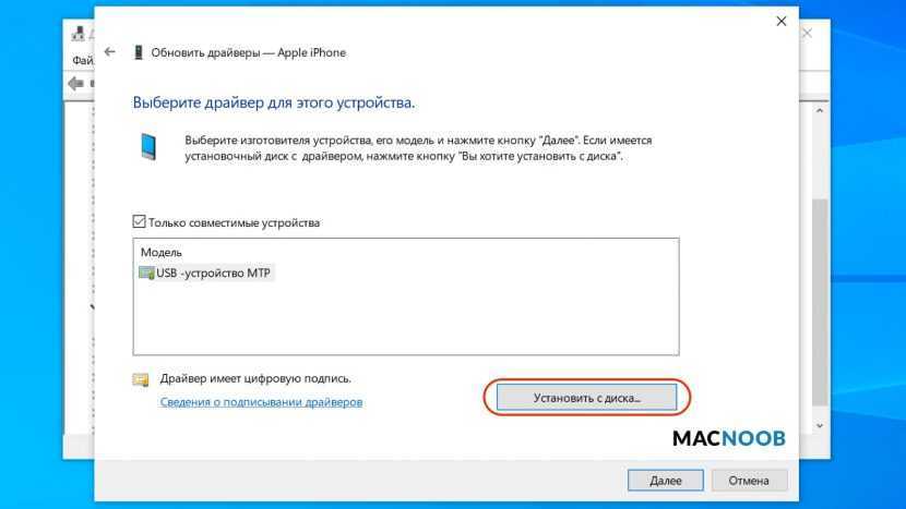 Далее выбираем USB-устройство MTP и нажимаем «Установить с диска».