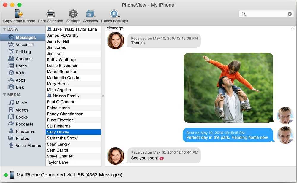 Приложение для совместимых устройств Mac. Бесплатно, за дополнительную плату можно получить место в облачном хранилище. Главное преимущество Phone View — простота. Но набор функций невелик (по сравнению, скажем, с iMobileTrans). Но есть возможность создавать резервные копии для SMS и MMS сообщений. Если iOS-устройство уже синхронизировано с iTunes, оно будет автоматически добавлено в программу, никаких дополнительных настроек не требуется.