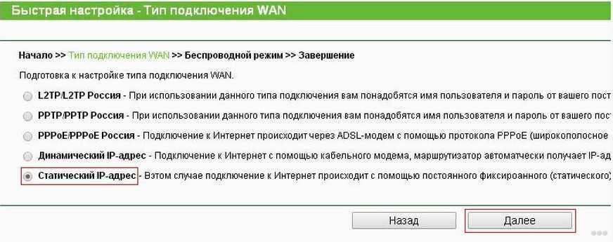 - Теперь нам нужно выбрать тип подключения (нужно узнать у провайдера). У нас же настройки для статического IP-адреса.