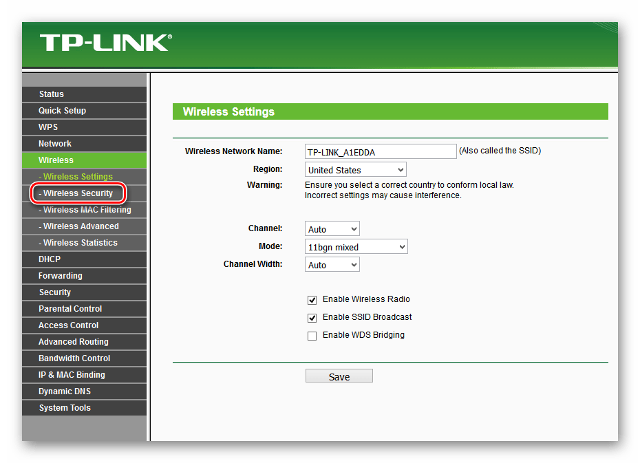 Возможен и второй метод запаролить роутер TP-Link. В веб-интерфейсе маршрутизатора имеется специальная страница конфигурации беспроводной сети. Можно напрямую перейти туда и установить кодовое слово.