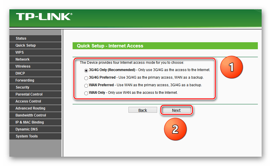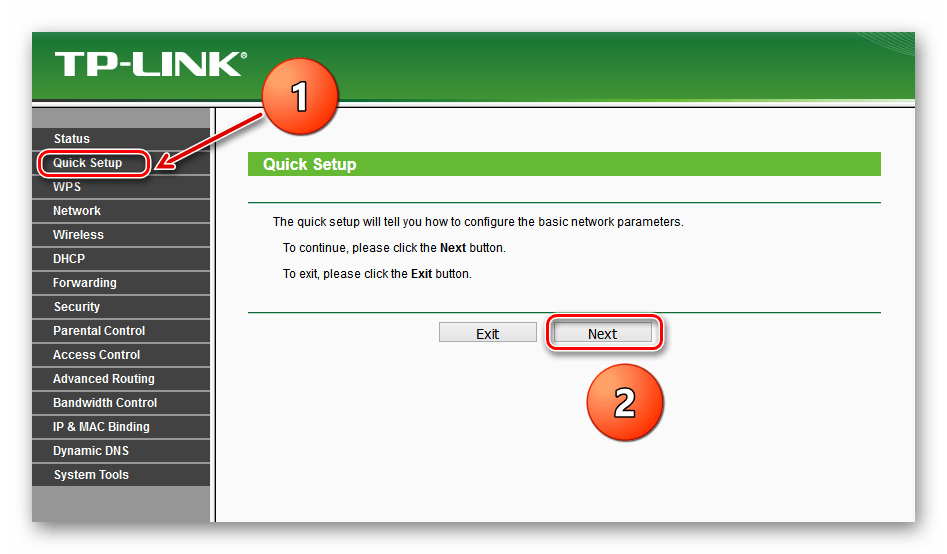 Входим в веб-интерфейс роутера. В левом столбце выбираем пункт «Quick Setup» и затем кликом на кнопку «Next» запускаем быструю настройку базовых параметров маршрутизатора.