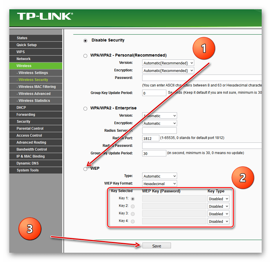 Возможен также вариант кодировки WEP, и тогда пароли набираем в полях для ключей, их можно использовать до четырёх штук. Теперь нужно сохранить изменения конфигурации кнопкой «Save».