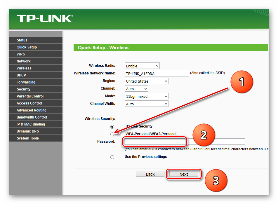 Для удобства пользователя в веб-интерфейсе роутера TP-Link присутствует специальный инструмент — мастер быстрой настройки. Он позволяет быстро настроить основные параметры маршрутизатора, в том числе и установить пароль на беспроводную сеть.
