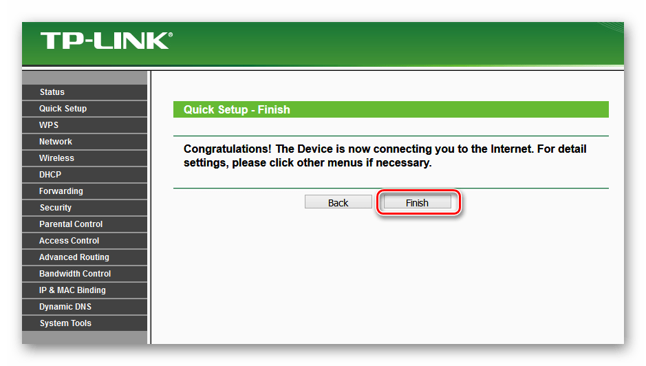 На последней вкладке мастера быстрой настройки роутера остаётся только щёлкнуть по «Finish».