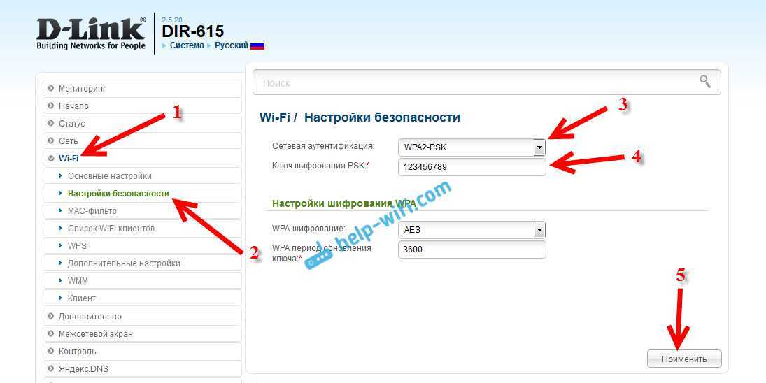 Зайдите в настройки своего роутера D-Link по адресу 192.168.0.1. Можете смотреть подробную инструкцию по этой ссылке. В настройках откройте вкладку Wi-Fi — Настройки безопасности. Установите тип безопасности и пароль, как на скриншоте ниже.