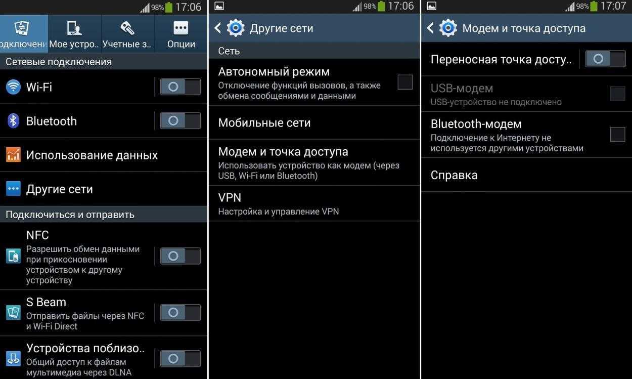 Раздача по Wi-Fi или через USB-кабель с телефонов Samsung Galaxy не вызывает затруднения. Bluetooth может вызывать затруднения, поэтому его используют редко. Перечисленные варианты выручат в случае поломки роутера. Но такой способ подходит для домашнего использования, чтобы экономно расходовать мобильный трафик.