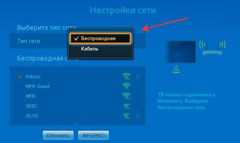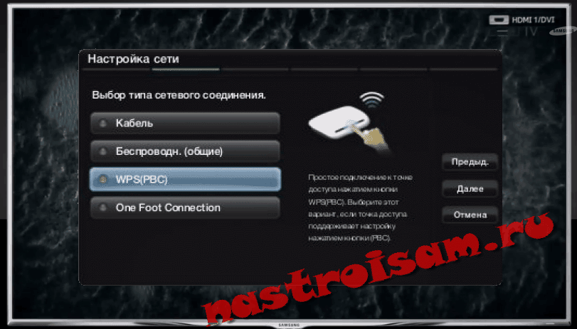 Примечание: Если Ваш телевизор и Ваш роутер поддерживают технологию WPS, то подключение телевизора через Wi-Fi можно сделать ещё проще. Для этого нажимаем на роутере кнопку «WPS», а в мастере настроек сети телевизора выбираем пункт «WPS»: