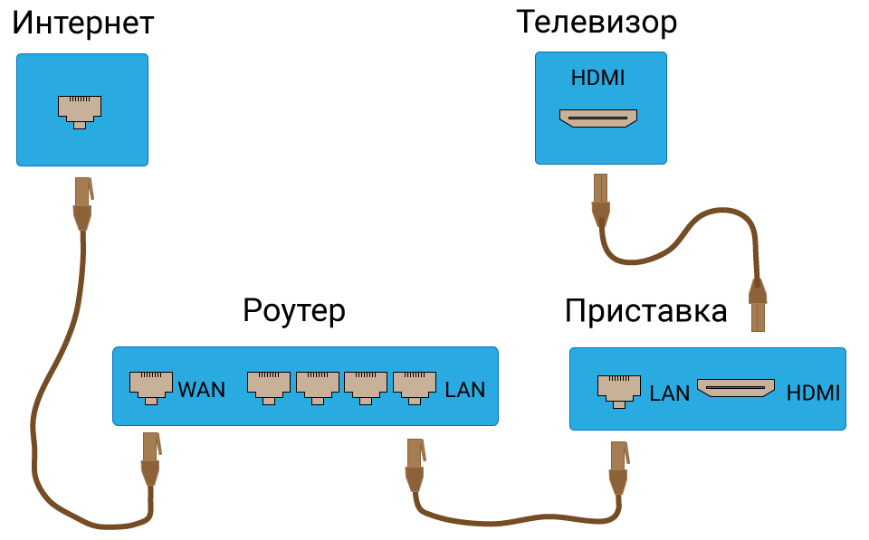 Ниже приведена схема, при которой роутер с ТВ приставкой связан по кабелю Ehternet. Возможно так же это подключение организовать через Wi-Fi.