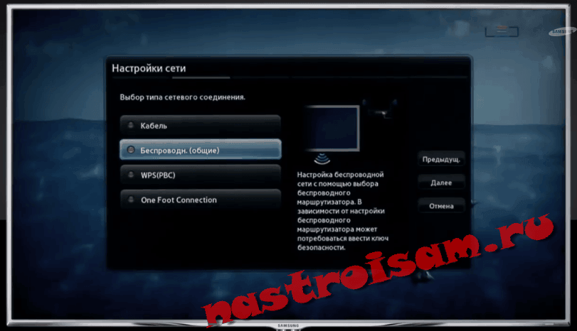 Будем считать, что роутер у вас настроен, интернет работает и проблем с подключением клиентских устройств нет. На телевизоре ищем тот же самый пункт меню «Настройка сети», как было описано в подключении по кабелю. Поскольку кабель не подключен, вам будет предложено настроить подключение, нажав кнопку «Далее». Способ подключения выбираем «Беспроводная сеть» и ждём пока будут найдены доступные wi-fi подключения.