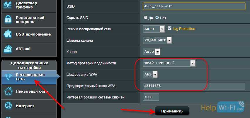 Задайте все необходимые параметры, как у меня на фото ниже. В поле Ключ шифрования PSK укажите пароль, который будет использоваться при подключению к вашему Wi-Fi. Пароль английскими буквами, цифры. Минимум 8 символов (советую ставить пароль ровно в 8 символов). Запишите пароль на бумажку, что бы не забыть.