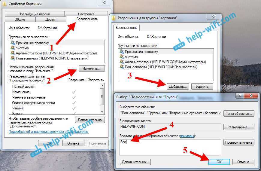 В свойствах папки, перейдите на вкладку Безопасность, и нажмите на кнопку Изменить. Откроется еще одно окно, в котором нажимаем на кнопку Добавить. В поле пишем «Все» и нажимаем Ok.