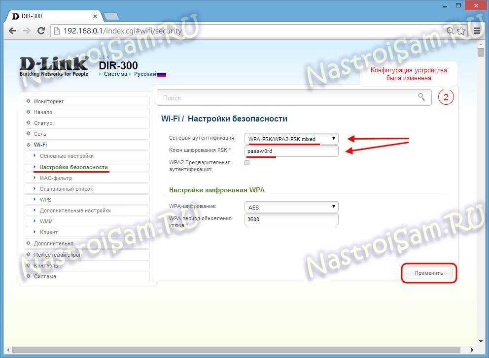 Здесь надо выбрать самый безопасный на текущий момент стандарт безопасности — WPA2-PSK. Если у Вас есть старые устройства, не поддерживающие его — ставьте смешанный режим «WPA-PSK/WPA2-PSK-mixed». В поле «Ключ шифрования PSK» надо ввести пароль на Ваш Wi-Fi и применить настройки. На этом базовое конфигурирование закончено, можно подключаться.
