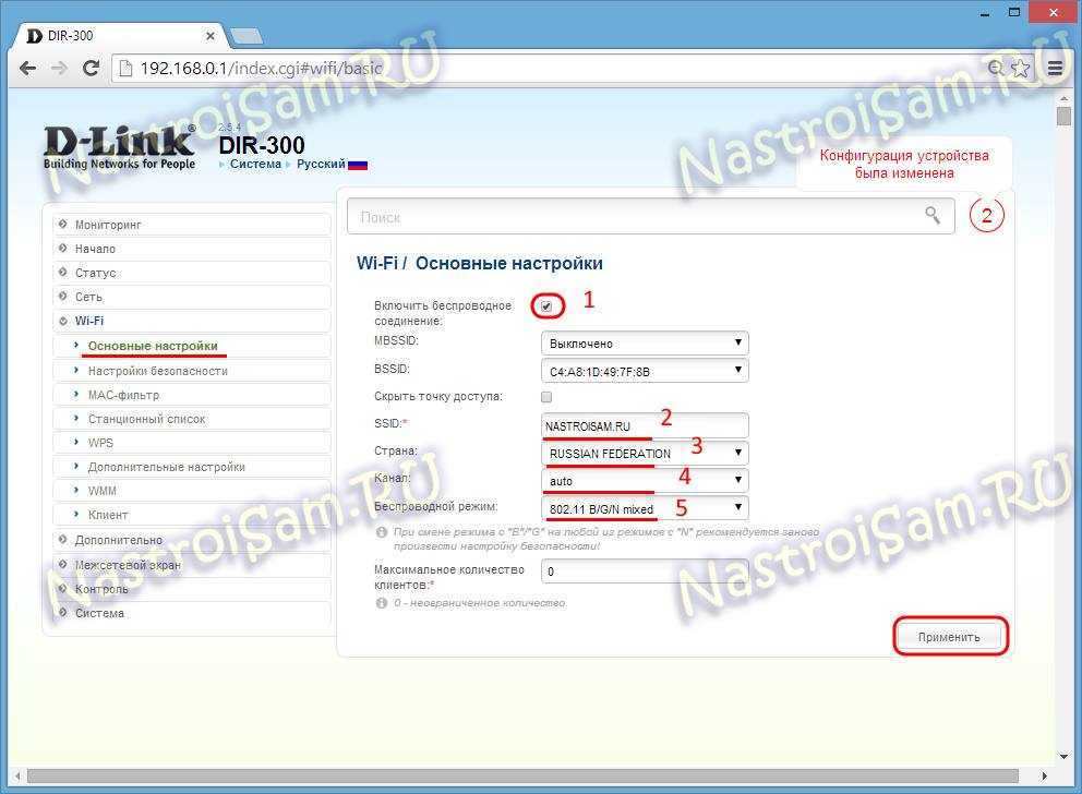 Следим чтобы стояла галочка «Включить беспроводное соединение». Затем в поле «SSID» надо прописать имя нашей Вай-Фай сетки. В качестве него можно использовать любое слово на латинице или цифры. Параметр «Страна» (он же «Country» или «Region») отвечает за количество используемых радиоканалов. Вам надо выбрать значение «Россия» или «Russian Federation». Если в списке таких нет — выбирайте значение «Европа» (Europe). Параметр «Канал» отвечает за используемый Вашей домашней сетью Wi-Fi радиоканал. Оптимальнее всего его оставить в значении «Авто». В списке «Беспроводной режим» надо поставить смешанный тип — 802.11 B/G/N mixed или 802.11 B/G mixed. Нажимаем кнопку «Применить».