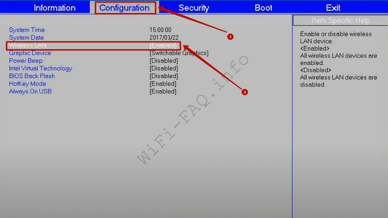 - пункт «Wireless LAN» ― или аналогичный ― должен быть в состоянии «Enabled»;