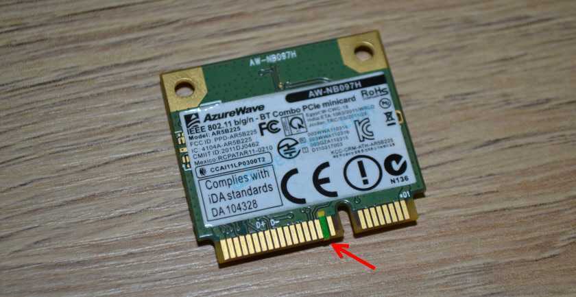 На Wi-Fi модуле, который подключается в разъем Mini PCI-e нужно заклеить 20 контакт. Но 20-тый он не по счету (по счету получается 17), а потому, что такой номер он имеет на схеме этой платы.