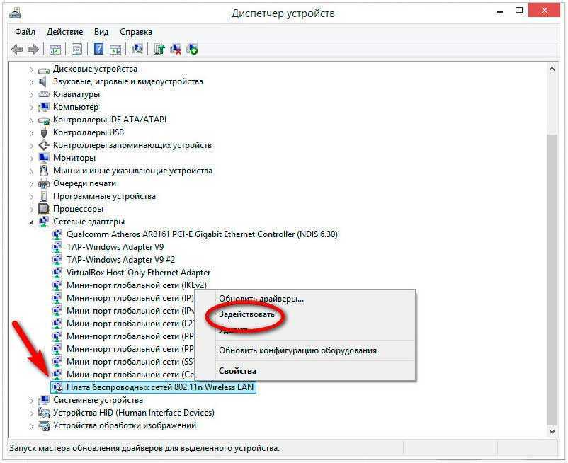Задействуйте его, кликнув по нему ПКМ и выбрав в меню соответствующую опцию. Включить или отключить адаптер также можно из Диспетчера устройств. Откройте его командой control /name Microsoft.Device Manager. Найдите в разделе «Сетевые адаптеры» отвечающий за беспроводное подключение (в его названии будет Wi-Fi или LAN).
