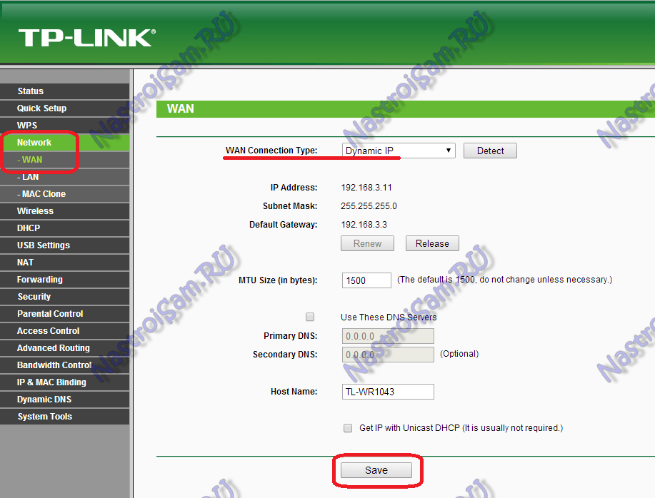 То есть Вы должны соединить один из LAN-портов первого устройства, в который приходит кабель провайдера с портом Интернет (или WAN) второго. Соединять их через LAN-порты я бы не советовал (хотя ниже я рассмотрел и такой вариант), так как это не совсем правильно. После этого надо ещё правильно всё настроить. На первом маршрутизаторе делать, впринципе, ничего не надо. Единственное — проверьте, чтобы в разделе LAN был включен DHCP-сервер. На втором — Вам надо зайти в раздел WAN и выбрать «Тип подключения» — «Динамический IP» (WAN Connection Type — Dynamic IP):