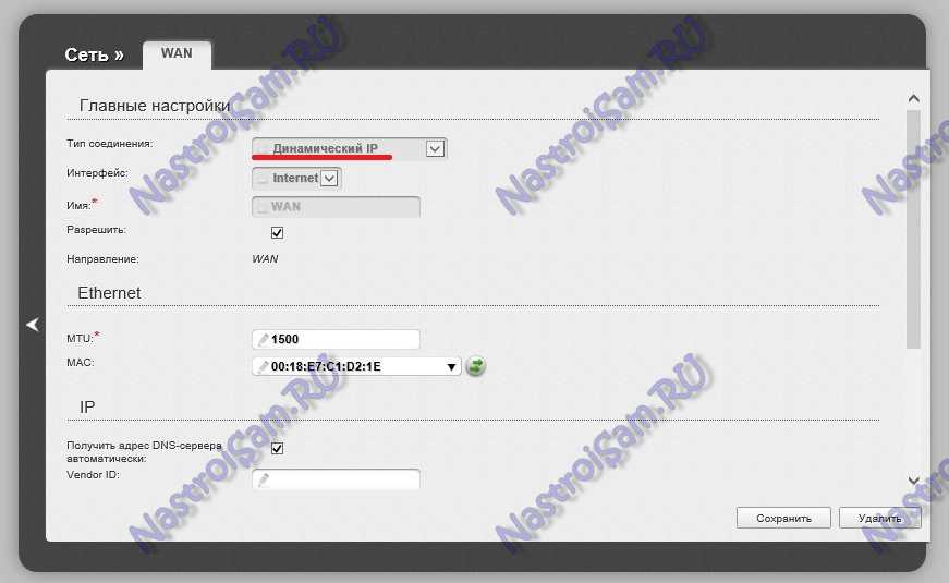 Кстати, на некоторых WiFi-маршрутизаторах тип подключения — «Динамический IP» используется по умолчанию, на заводских настройках. К ним относятся устройства от D-Link: