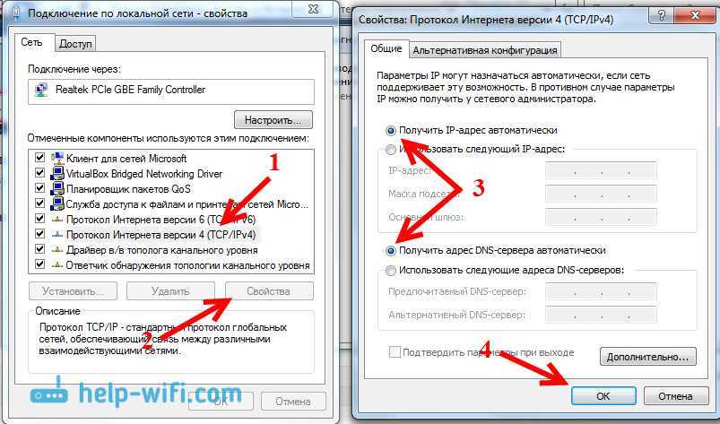Дальше, выделяем “Протокол интернета версии 4. “, нажимаем на кнопку “Свойства”, и если в новом окне у вас заданы какие-то адреса, то ставим автоматическое получение IP и DNS, и нажимаем Ok.