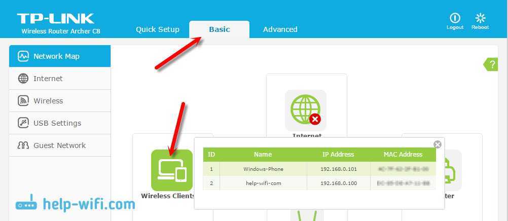 Некоторые топовые модели роутеров от TP-LINK, уже обзавелись новым веб-интерфейсом. В основном, это устройства из линейки Archer (но не все). В настройках, в новой панели управления, перейдите сверху в раздел «Basic» (базовая настройка). Вы увидите карту сети. Там будут беспроводные клиенты. Нажимаем на них, и сбоку, или снизу появится список устройств, которые подключен к вашему Wi-Fi.