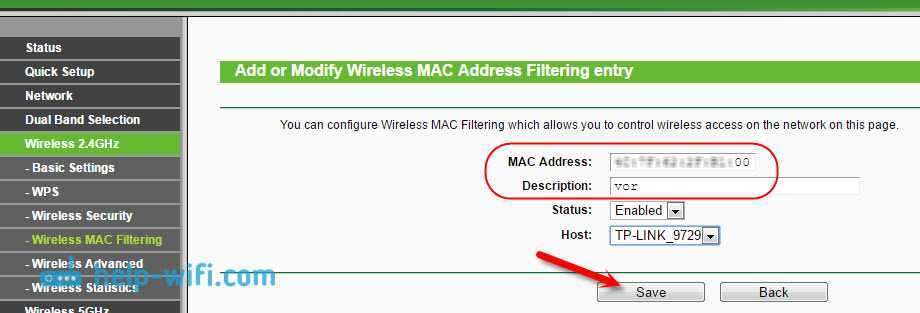 Теперь все очень просто – в верхнюю строку вводим MAC-адрес, который хотим «отсечь», и чуть ниже выбираем «Enabled», а затем сохраняем настройки.