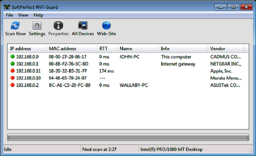 Эта программка, как и предыдущая позволяет сканировать беспроводные сети и формировать таблицу в которой отображается полный список пользователей вайфай. Существует возможность вести статистику, благодаря формированию файла в формате xml (для Exel). Так же как и в первой программе вы можете настроить оповещение при подключении нового устройства.