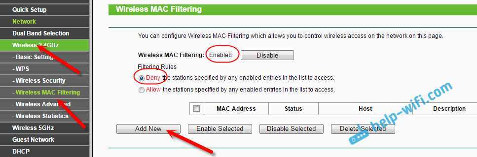 Фильтрация должна быть включена (в статусе Enabled). А настройки блокировки в статусе «Deny» (Запретить). Нажмите на кнопку «Add New» (добавить), что бы добавить новое устройство.