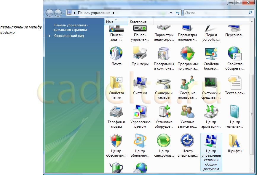Для удобства восприятия мы используем классический вид панели управления. Для переключения между видами используйте соответствующую кнопку, как показано на рис.