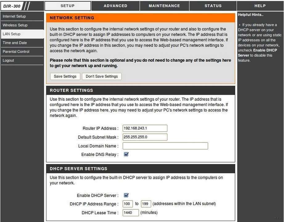 - Идём в раздел «Setup» – LAN Setup», где в поле «Router IP Address» вводим «192.168.243.1».