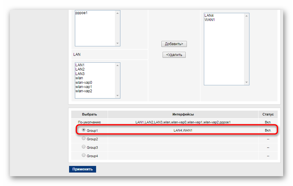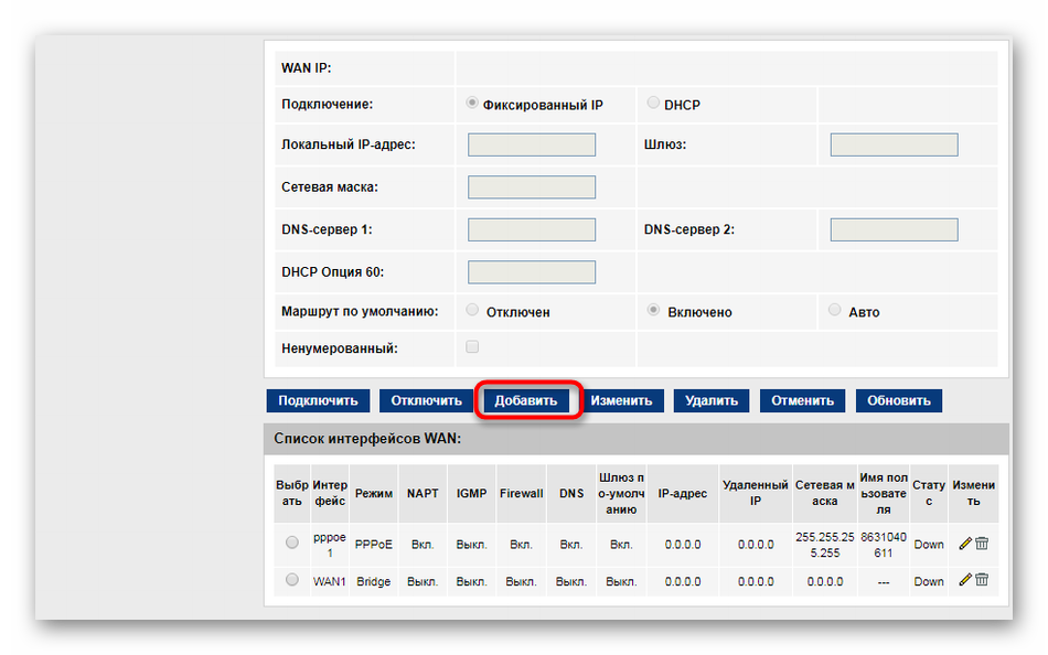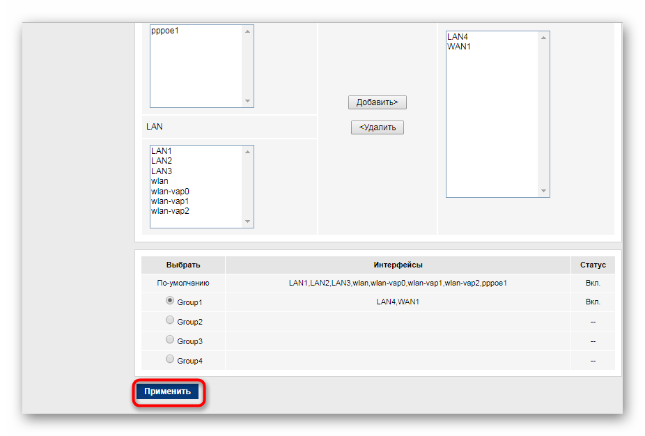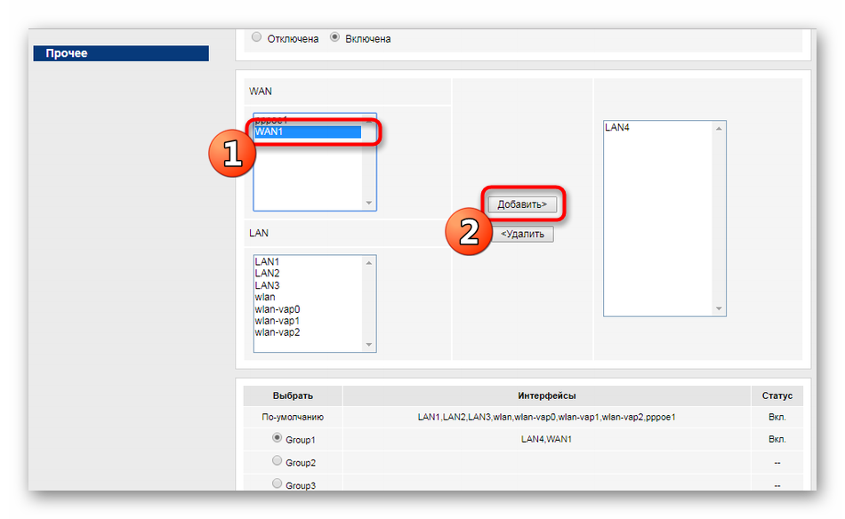 Поднимитесь вверх, чтобы в группе выбрать интерфейс «WAN1» и кликнуть на «Добавить».
