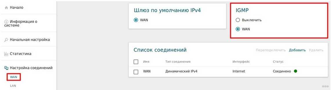 - Функция IGMP Proxy на роутерах D-Link дарит возможность смотреть IPTV на ПК и телевизорах, которые подключаются в домашнюю сеть. Если она деактивирована, в «Настройках соединения» переходим во в кладку «WAN» и активируем данную опцию для используемого интерфейса.