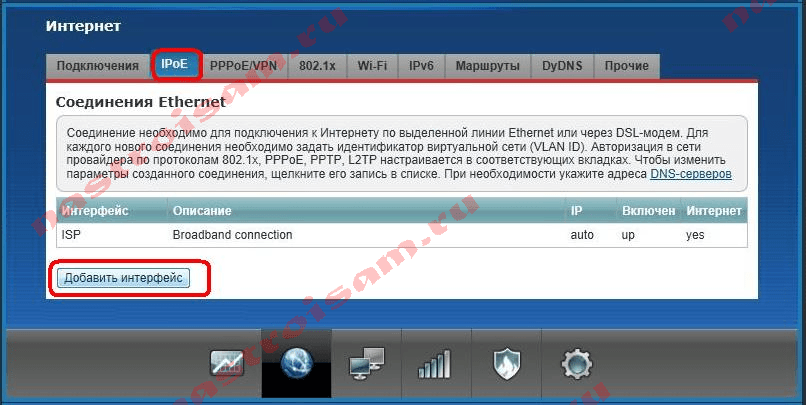 - Создаём новое соединение IPoE с VLAN 10 (порт для IPTV). Для этого переходим «Интернет» – «IPoE» и добавляем новый интерфейс с идентификатором VLAN, равным 10.