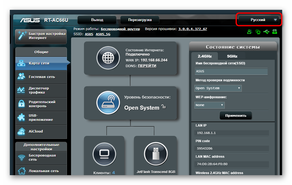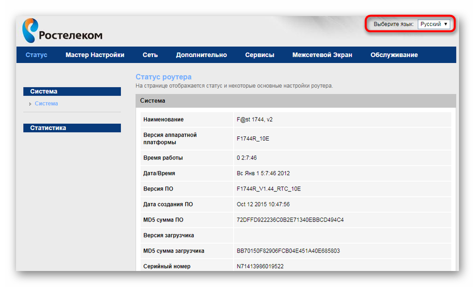 После открытия веб-интерфейса лучше изменить язык на более удобный, выбрав подходящий вариант из всплывающего меню.