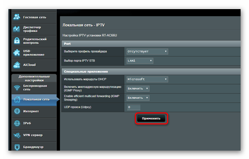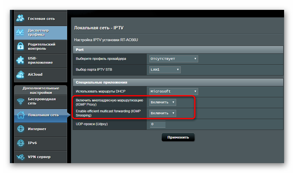 - поставить «Включить» в выпадающем списке «IGMP Proxy»