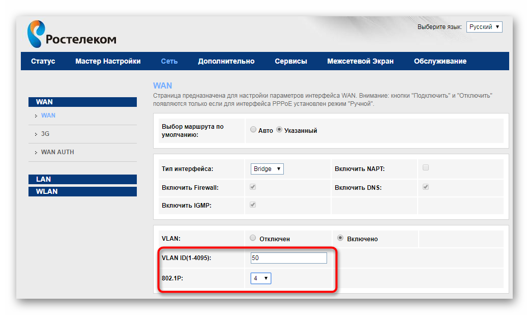 Теперь задайте VLAN ID. В большинстве случаев нужно установить значение 50, но мы сначала советуем связаться с компанией, предоставляющей интернет-услуги, чтобы уточнить этот параметр. Приоритет в строке «802.1P» задайте 4.