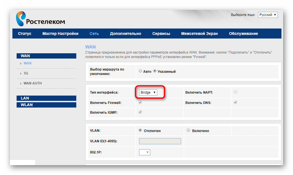 Если вверху окна есть поле выбора режима, то нужно выбрать режим Мост;: