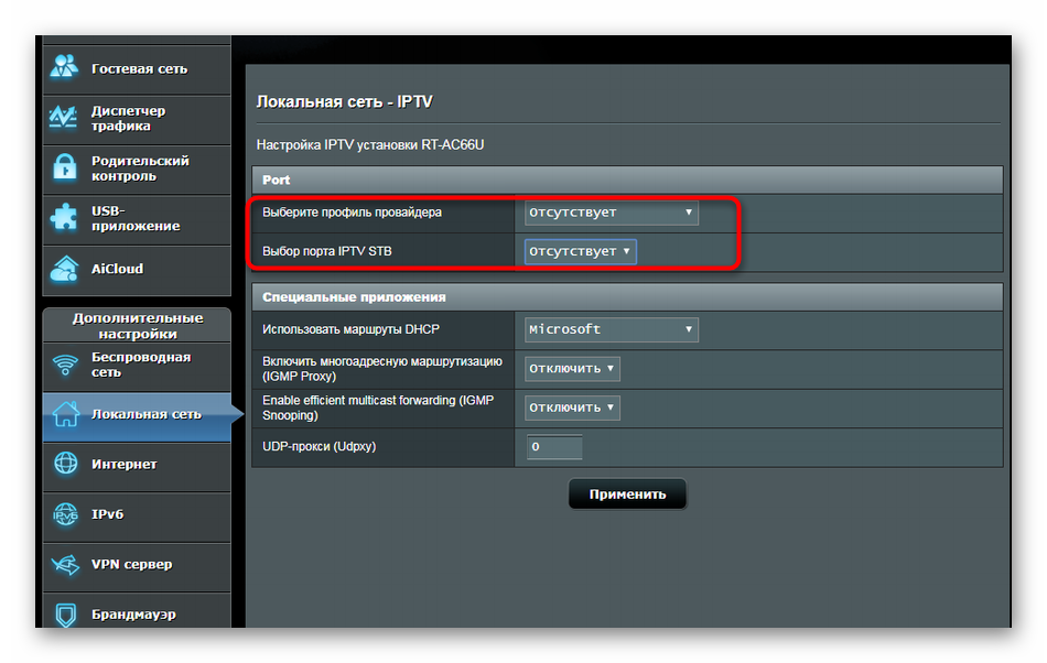 Сначала выберите профиль провайдера и порт IPTV (разъем, через который будет подсоединяться кабель). Если у вас нет информации по поводу профиля провайдера, оставьте это поле пустым или уточните информацию, обратившись по телефону технической поддержки.