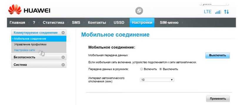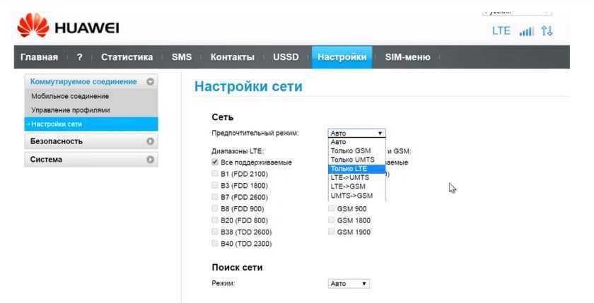 «Настройка сети» – можно установить режим работы сети: GSM (2G), UMTS (3G), LTE (4G), или смешанные режимы. Эти настройки могут пригодится при настройке антенны, или не очень стабильном подключении.