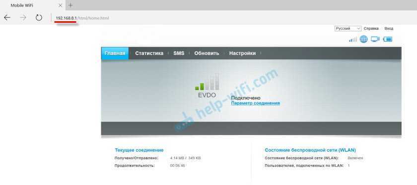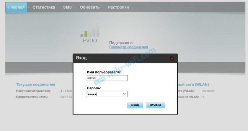 Если у вас модем Хуавей без Wi-Fi, то вы без проблем можете перейти в любой раздел: Статистика, SMS, USSD, Настройки и т. д. Ну а если у вас модем с возможностью раздачи Wi-Fi, то без ввода логин и пароля будет отображаться только главная страница. А если вы попытаетесь зайти в настройки, или в другой раздел, то появится окно «Вход» с запросом имени пользователя и пароля. Обычно заводское имя пользователя и пароль на модемах с Wi-Fi от Huawei – admin и admin.