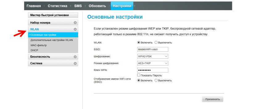 Следующий этап — настройка WiFi-сети происходит через вкладку WLAN: