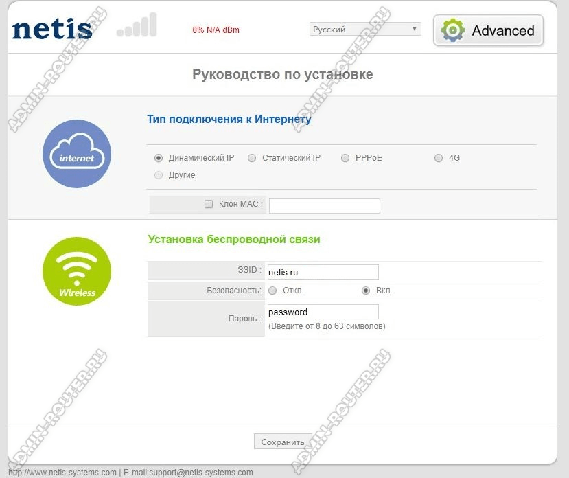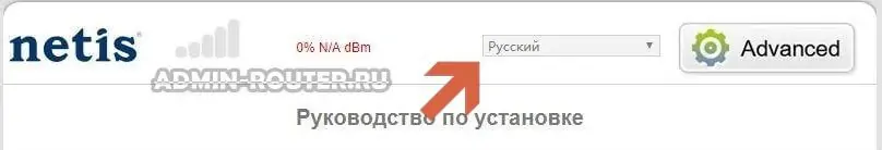 Для удобства дальнейшей работы, я бы рекомендовал сразу же поменять язык интерфейса на русский. Делается это простым выбором языка из выпадающего списка в верхней части страницы http://netis.cc.